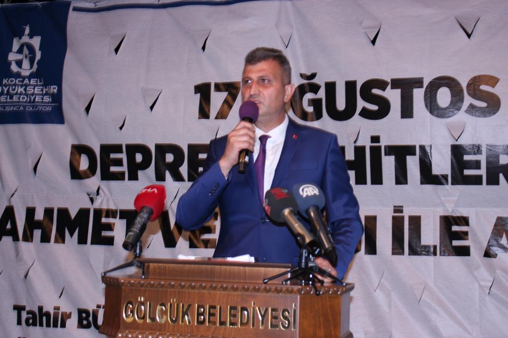 Başkan Sezer’in ardından kürsüye Kocaeli Büyükşehir Belediye Başkanı Tahir Büyükakın çıktı. Başkan Büyükakın konuşmasında, “21 yıl önce asrın felaketi dediğimiz bir felaketi anmak için bir araya gelmiş bulunuyoruz. Anma programları bizim için kıymetli. İstiyoruz ki bir daha başımıza gelmesin. Elhamdülillah hepimiz Müslümanız. Bu bize felaketlerden daha çabuk çıkma imkânı veriyor. Akla inanan bir dinimiz var. Bizlere düşen deprem gerçeğini bilimin sorumluluk alanına bırakmak. O günden bu güne birçok şey yapıldı. Şuanda Kocaeli’de 300 bin bina var. Çok sayıda bina yıkıldı. 37 bin bina yıkıldı o gün.” Dedi.