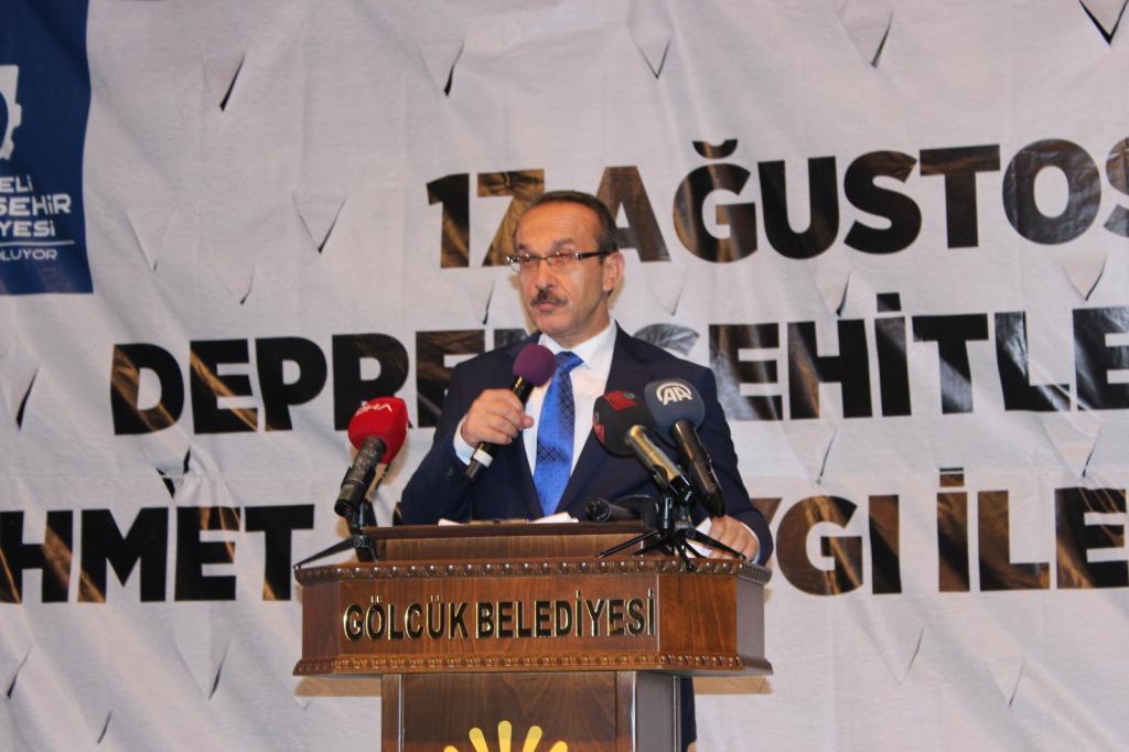 Etkinlikte ilk konuşmayı Gölcük Belediye Başkanı Ali Yıldırım Sezer gerçekleştirdi. “17 Ağustos depremi, sadece 45 saniyede bir şehrin hayatının nasıl değiştiğini gösterdi” diyerek konuşmasına başlayan Sezer, 45 saniyede çok şey öğrendiklerini belirtti. Sözlerine devam eden Sezer, “Depremin değil binaların insan hayatını sonlandırdığını öğrendik. Bunun her zaman yaşanabileceğini bize gösterdi. Depremde hayatını kaybeden toplam 18 bin kişinin 5 binini Gölcük’te kaybettik. Bunlara rağmen Gölcük’lü hemşehrilerimiz yaşamaya devam etti. Gölcük küllerinden doğdu. Bugün depremin ciddiyetinin farkında olan ve geleceğe ümitle bakan bir gölcük var. Tekrar böyle bir depremin yaşanmamasını Allah’tan niyaz ediyorum.” Dedi.