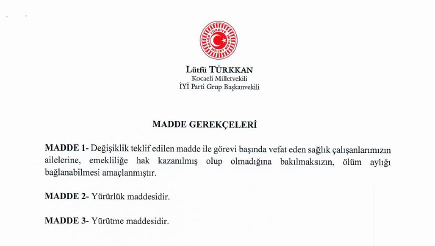 İYİ Parti Grup Başkanvekili Lütfü Türkkan, görevi başında vefat eden sağlık çalışanlarının emekliliğe hak kazanılmış olup olmadığına bakılmaksızın, ailelerine ölüm aylığı bağlanabilmesi için kanun teklifi verdi.