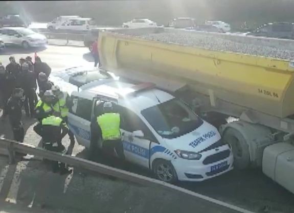 Alınan bilgiye göre, TEM Otoyolu’nun Hasdal mevkisi Edirne istikametinde uygulama yapan Trafik Denetleme Şube Müdürlüğü ekipleri, bir kamyonu durdurmak istedi. Bu sırada arkadan gelen 34 KA 9710 plakalı hafriyat kamyonu, sürücüsünün direksiyon hakimiyetini kaybetmesi sonucu önce yol kenarında bulunan polis aracına, sonra emniyet şeridindeki bir polis memuruna çarptı.