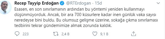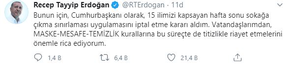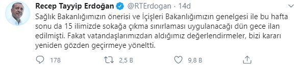 Cumhurbaşkanı Recep Tayyip Erdoğan, dün gece İçişleri Bakanlığı tarafından ilan edilen ve 15 ili kapsayan sokağa çıkma yasağının iptal edildiğini açıkladı.