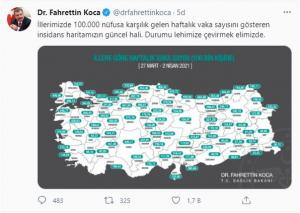Sağlık Bakanı Fahrettin Koca da sosyal medya hesabından yaptığı paylaşımla, İllerimizde 100.000 nüfusa karşılık gelen haftalık vaka sayısını gösteren haritanın güncel halini paylaştı.