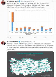 Bakan Koca, Twitter hesabından yaptığı paylaşımında, “Son bir haftada vaka sayısı en çok artan illerimiz; Siirt, Giresun, Bingöl, Diyarbakır ve Kırıkkale. Aşı İle Toplumsal bağışıklık elde edilene kadar tedbirlere uymak zorundayız. Sevdiklerinizi tehlikeye atmayın” diye konuştu.