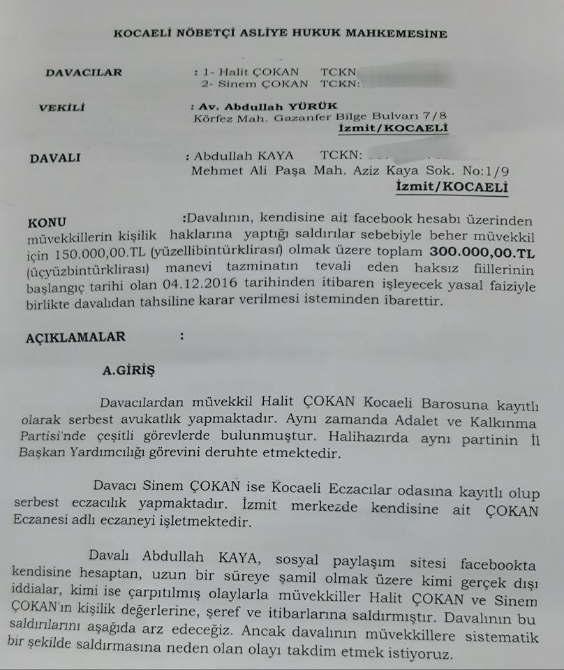 AK Partili bazı siyasilere yoğun muhalefeti ile bilinen Selam Tv sahibi ve Kocaeli İlme Hizmet Vakfı yetkilisi Abdullah KAYA tarafından sosyal medyada yapılan eleştiri niteliğinde paylaşımlar Halit ÇOKAN ve eczacı eşi tarafından manevi zararın gerekçesi olarak gösterildi. Saygın bir kişi olduklarını dilekçelerinde ifade eden Halit ÇOKAN ve Eczacı eşi Sinem ÇOKAN yapılan eleştiriler nedeniyle kişilik haklarına zarar geldiğini ileri sürerek KAYA’dan 300 bin TL tazminat talep ettiler.