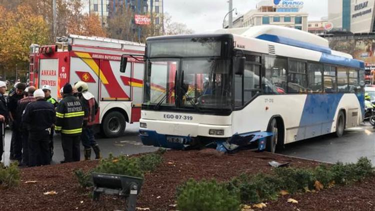 Başkent’in en yoğun yaya ve araç trafiğinin olduğu Kızılay Meydanı’nda plakası henüz belirlenemeyen Ankara Büyükşehir Belediyesi’ne ait otobüs, bugün saat 15.30 sıralarında freninin boşalması sonucu kontrolden çıkarak yayalara çarptı. Kazada, ilk belirlemelere göre 2 kişi yaralandı. Yaralılar, çevredekiler ve olay yerine gelen sağlık ekiplerinin yardımıyla kurtarılarak hastaneye kaldırıldı. Gaz kaçağına karşı otobüs çevresinde önlem alındı. Polis ekipleri, olay yerinde incelemede bulundu.