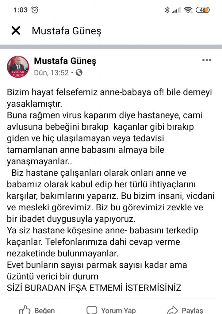 Kocaeli Darıca İlçesinde hizmet veren Darıca Farabi Eğitim ve Araştırma Hastanesinde yaşanan ve hastane başhekimi Mustafa Güneş’in sosyal medya paylaşımı ile ortaya çıkan olayda bunlardan biri oldu.  Güneş, hastanede çeşitli rahatsızlıkları sebebiyle yatmakta olan, ancak tedavileri tamamlanarak taburcu edilen yaşlı hastaların, yakınları tarafından alınmayarak kaderine terk edilmesine sosyal medya hesabında adeta isyan etti.  Paylaşımın sonuna ise ‘Sizi buradan ifşa etmemi ister misiniz?’   notunu düştü.Başhekim Güneş’in yaptığı paylaşımda şu ifadeler yer aldı. “Bizim hayat felsefemiz anne-babaya of! bile demeyi yasaklamıştır.Buna rağmen virüs kaparım diye hastaneye, cami avlusuna bebeğini bırakıp  kaçanlar gibi bırakıp giden ve hiç ulaşılamayan veya tedavisi tamamlanan anne babasını almaya bile yanaşmayanlar..  Biz hastane çalışanları olarak onları anne ve babamız olarak kabul edip her türlü ihtiyaçlarını karşılar, bakımlarını yaparız. Bu bizim insani, vicdani ve mesleki görevimiz. Biz bu görevimizi zevkle ve bir ibadet duygusuyla yapıyoruz. Ya siz hastane köşesine anne- babasını terk edip kaçanlar. Telefonlarımıza dahi cevap verme nezaketinde bulunmayanlar. Evet bunların sayısı parmak sayısı kadar ama üzüntü verici bir durum SİZİ BURADAN İFŞA ETMEMİ İSTERMİSİNİZ. Başhekim  Güneş’in  haberin gündem olması üzerine “Ben paylaşımımın bu kadar yankı bulacağını tahmin etmiyordum. Sıradan bir paylaşım yaptım” dediği öğrenildi.