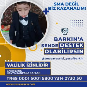Kocaeli’nde oturan ve Kocaeli İl Emniyet Müdürlüğünde görev yapan Barış Kaplan ile İzmit’te bir bankada çalışan Havva Kaplan’ın henüz 4 yaşındaki çocukları Barkın Kaplan’ın bir süre önce rahatsızlanması üzerine yapılan tetkikler sonucu SMA Tip 1 hastalığına yakalandığı belirlendi. Barkın için alınan raporlar sonrasında, hastalığın tedavisi için yurt dışına gitmesi ve fiyatı 2.1 milyon dolar olduğu öğrenilen ilaç tedavisine başlanması amacıyla Kocaeli Valiliğine başvurularak kampanya izini alındı. Kaplan ailesi “SMA değil, Barkın kazansın” sloganı ile başlattığı kampanyaya herkesten destek bekliyor. Kampanyaya Vakıfbank’ta Havva Kanpara Kaplan adına açılan TR69 0001 5001 5800 73142730 30 nolu İBAN’a hesabına katkıda bulunarak destek olunabilir.