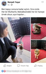 Sokak hayvanları için yaptığı projelerle tanınan hayvan sever kardeşimiz Nurşah Yaşar, sosyal medya sayfasından dikkat çeken bir paylaşımda bulundu. Soğuk kış gününde karlı havada üşüyen bir kediyi kapalı ortama alarak ısınmasını sağlayan Nurşah Yaşar, mahallelere önderlik eden muhtarlara da çağrı yaptı. Yaşar, muhtarların mahalledeki hanelere örnek olması adına. muhtarlık hizmet binalarının kapısını en azından karlı havalarda sokak hayvanlarına açmasını istedi. Yaşar paylaşımında, “Ben kapıyı sonuna kadar açtım. Sıra sizde. Her bir Muhtarlık, Mahallesindeki her bir haneye örnek olsun; açın kapıları…” dedi.