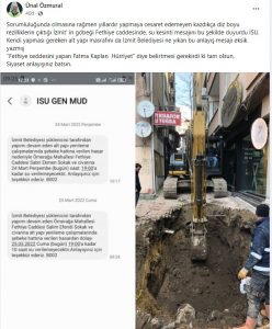Sosyal medya üzerinden yaptığı paylaşımla Fethiye Caddesi’nin en dar sokaklarında titizlikle çalışıldığını gösteren Özmural paylaşımında şu ifadelere yer verdi: Sorumluluğunda olmasına rağmen yıllardır yapmaya cesaret edemeyen, kazdıkça diz boyu rezilliklerin çıktığı İzmit’in göbeği Fethiye Caddesi’nde su kesintisini bu şekilde duyurdu İSU. Kendi yapması gereken altyapı masrafını da İzmit Belediyesine yıkan bu anlayış mesajı eksik yazmış. “Fethiye Caddesi’ni yapan Fatma Kaplan Hürriyet” diye belirtmesi gerekirdi ki tam olsun. Siyaset anlayışınız batsın”