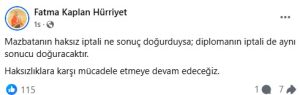 İzmit Belediye Başkanı Fatma Kaplan Hürriyet yaptığı açıklamada, ‘ Mazbatanın haksız iptali ne sonuç doğurduysa, diplomanın iptali de aynı sonucu doğuracaktır. Haksızlıklara karşı mücadele etmeye devam edeceğiz.’