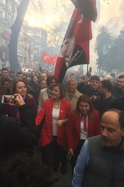 CHP İzmit Belediye Başkanı Fatma Kaplan Hürriyet, Leyla Atakan’ın kabrini ziyaret ettikten sonra CHP İzmit İlçe Binası önüne geldi. Hürriyet’e burada yoğun sevgi gösterisinde bulunuldu. Gençlerin meşaleleri altında milleti selamlayan Hürriyet, vatandaşlara seslendi.