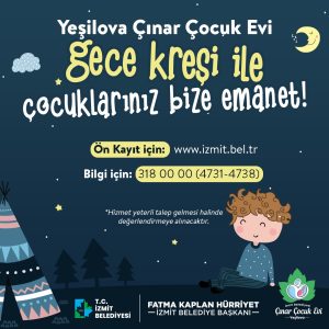 İzmit Belediye Başkanı Fatma Kaplan Hürriyet seçimden önce verdiği sözlerden birini daha tutarak hayata geçirdiği “Gece Kreşi” ile aileler gece mesaisindeyken, çocukları Gece Kreşi’nde güvenli bir şekilde kalabilecek. Uzman eğitmenler gözetimindeki çocuklar güvenli bir ortamda uyuyacak, öğrenmenin ve oyun oynamanın keyfini çıkaracak.