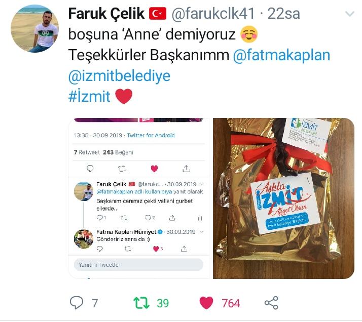 Çelik’in, pişmaniye festivali ile ilgili sosyal medya hesaplarına “Başkanım canımız çekti valla gurbet ellerde” yorumuna “göndeririz sana da” diyen Hürriyet, İzmitli öğrenciye sürpriz yaptı. Başkan Hürriyet’in afiyet olsun dikekleriyle birlikte Samsun’a gönderdiği İzmit pişmaniyesi karşısında şaşkınlığını ve mutluluğunu gizleyemeyen Faruk Çelik yine sosyal medya hesabı üzerinden duygularını ifade etti. Pişmaniye sürprizi karşında duyduğu mutluluğu ifade eden Çelik “boşuna anne demiyoruz teşekkürler başkanım” diyerek Başkan Hürriyet’e teşekkürlerini iletti.