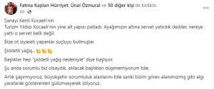 Bize ot siyaseti yapanlar suçluyu bulmuşlar. Şiddetli yağış… Başlıklar hep “şiddetli yağış nedeniyle” diye başlıyor. Şu anda sorumlu biz olsaydık, atılacak başlıkları düşünemiyorum bile. Artık şaşırmıyoruz, büyükşehir sorumluluk alanlarını bile sanki bizim görev alanımızmış gibi algı yaratarak gösterenleri gülümseyerek izliyoruz.”