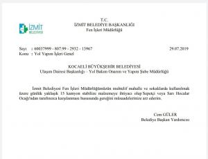 Ruhsat talep ettiğimiz terk edilmiş taş ocağı, Kocaeli Büyükşehir Belediyesine izin verilen yerin bitişiğinde bulunuyor. Ruhsatın tarafımıza verilmesi ve stabilize malzeme talebinin karşılanması halinde, köy yollarındaki yaşanan mağduriyetleri hızlıca gidereceğiz. Ayrıca Valilik’ten izin alana kadar Büyükşehir Belediyesine 3 kez Sepetçi veya Sarı Hocalar Taş Ocağı’ndan belediyemize stabilize malzeme temin edilmesi talebinde bulunduk. Büyükşehir’den olumlu dönüş yapılması halinde halkımızın taleplerini karşılayabileceğiz. Geçen yıl ağustos ayından beri taleplerimizin onaylanmasını beklediğimizi belirtir, süreci kamuoyunun takdirine sunarız.”