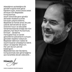 Başiskele’ye hizmet amacı ile yola çıkarak demokratik bir seçim sürecinin huzur ve sükunetle tamamlanmasında emeği olan tüm adaylara, İlçe Seçim Kurulumuza, Emniyet – Jandarma mensuplarımıza ve sandık görevlilerine şükranlarımı sunuyor, gönülden teşekkür ediyorum.