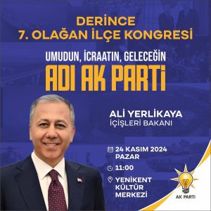 Ak Parti Derince 7. Olağan İlçe Kongresi 24 Kasım saat 11.00’de Derince Yeniköy Kültür Merkezi’nde gerçekleştirilecek. Derince ilçe kongresine İçişleri Bakanı Ali Yerlikaya katılım gösterecek.