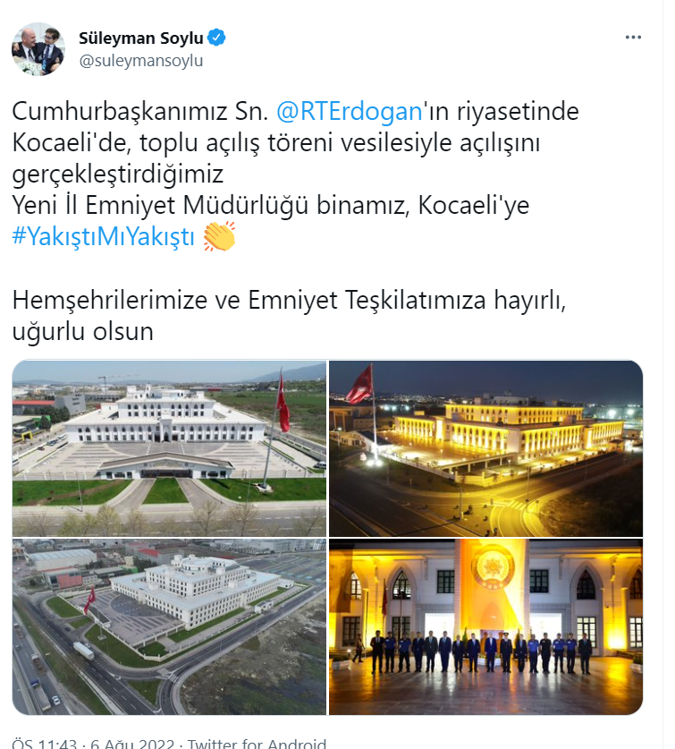 Dün toplu açılış bayramı programları kapsamında Cumhurbaşkanı Recep Tayyip Erdoğan ile birlikte Kocaeli’ye gelen İçişleri Bakanı Süleyman Soylu, Başiskele’de yapımı tamamlanarak resmi açılışı gerçekleşen eserlerden Kocaeli İl Emniyet Müdürlüğü binasını ziyaret etti. Kocaeli İl Emniyet Müdürü Veysal Tipioğlu ve Emniyet Teşkilatına çalışmalarında başarılar dileyen Bakan Soylu, hizmet binası ile ilgili Emniyet Müdürü Tipioğlu’ndan bilgiler aldı. Kocaeli İl Emniyet Müdürlüğü binasında gerçekleştirilen ziyareti sosyal medya hesabından paylaşan Bakan Soylu, “Cumhurbaşkanımız Sn. @RTErdogan’ın riyasetinde Kocaeli’de, toplu açılış töreni vesilesiyle açılışını gerçekleştirdiğimiz Yeni İl Emniyet Müdürlüğü binamız, Kocaeli’ye #YakıştıMıYakıştı Hemşehrilerimize ve Emniyet Teşkilatımıza hayırlı, uğurlu olsun” ifadelerini kullandı.