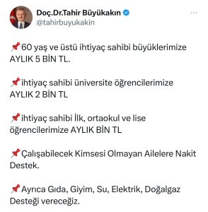 Başkan Büyükakın’dan ihtiyaç sahibi 60 yaş ve üstü vatandaşlara, ihtiyaç sahibi üniversite öğrencilerine, İLKOKUL ORTAOKUL ve LİSE öğrencilerine, çalışacak kimsesi olmayan ailelere nakit desteği verileceğini duyurdu.