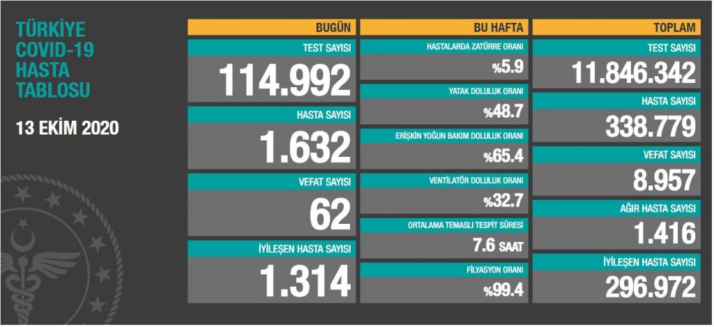Sağlık Bakanı Fahrettin Koca, 13 Ekim tarihine ait Türkiye’deki korona virüs hasta ve vefat sayısını açıkladı. Bakan Koca’nın açıkladığı veriye göre Türkiye’de bugün bin 632 yeni hasta tespit edildi, 62 kişi ise hayatını kaybetti.