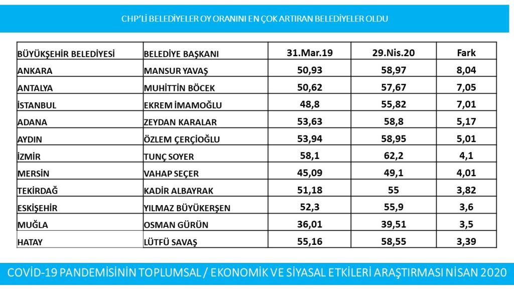 Araştırmaya göre 31 Mart 2019 yerel seçimlerinde yüzde 50,93 oy alarak Ankara Büyükşehir Belediye Başkanlığı’na seçilen Mansur Yavaş’ın 29 Nisan 2020 tarihi itibariyle oyunu yüzde 58,97’ye yükselttiğini ve büyükşehir belediye başkanları arasında yüzde 8,04’le, oyunu en fazla artıran belediye başkanı olduğunu dile getirdi.