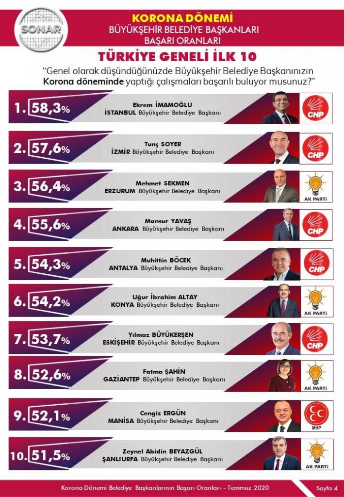 Sonar Araştırma’nın korona ile mücadelede belediyelerle ilgili yaptığı son araştırmasından çarpıcı sonuçlar çıktı. Türkiye genelinde yapılan araştırmaya göre, İstanbul Büyükşehir Belediye Başkanı Ekrem İmamoğlu, büyükşehirler arasında birinci oldu.
