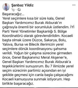 Şanbaz Yıldız, dün sosyal medya hesabından yaptığı paylaşımda, “Başaracağız. Yerel seçimlere kısa bir süre kala, Genel Başkan Yardımcımız Burak Akburak’ın çağrısıyla önemli bir sorumluluk üstlendim. İYİ Parti Yerel Yönetimler Başkanlığı 5. Bölge Koordinatörü olarak görevlendirildim. Kocaeli başta olmak üzere Düzce, Sakarya, Bolu, Yalova, Bursa ve Bilecik illerimizin yerel seçimlere dönük koordinasyonu şahsıma verildi. Yoğun bir çalışma sürecine girmeden önce, Genel Başkanımız Meral Akşener’e, Genel Başkan Yardımcımız Burak Akburak’a teşekkürlerimi sunuyorum. Bu 7 ilimizde yerel seçim sürecinin partimiz açısından en iyi şekilde geçmesi için canla başla çalışacağımı Kocaeli kamuoyuna sunmak istiyorum. Hep birlikte başaracağız” cümlelerini kullanmıştı.