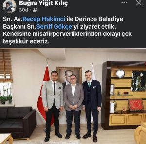 İYİ Parti Kocaeli İl Yöneticisi Buğra Yiğit Kılıç beraberinde Av. Recep Hekimci ile Derince Belediye Başkanı Sertif Gökçe’yi ziyaret etmiş. Yönetici Buğra Yiğit Kılıç bu ziyaretini x hesabından paylaşmış. Bu paylaşım sonrası İYİ Parti Derince İlçe Başkanı Alpay Çakırcı tepki göstermiş ve x hesabından bu ziyarete ilişkin sert mesajlar vermiş. İşte karşılıklı paylaşımlar sonrası yaşanan tartışma Kocaeli İl Başkanlığı’na taşınmış. İYİ Parti Derince İlçe Başkanı Alpay Çakırcı soluğu İl Başkanı Kamil Şirin’in yanında almış.