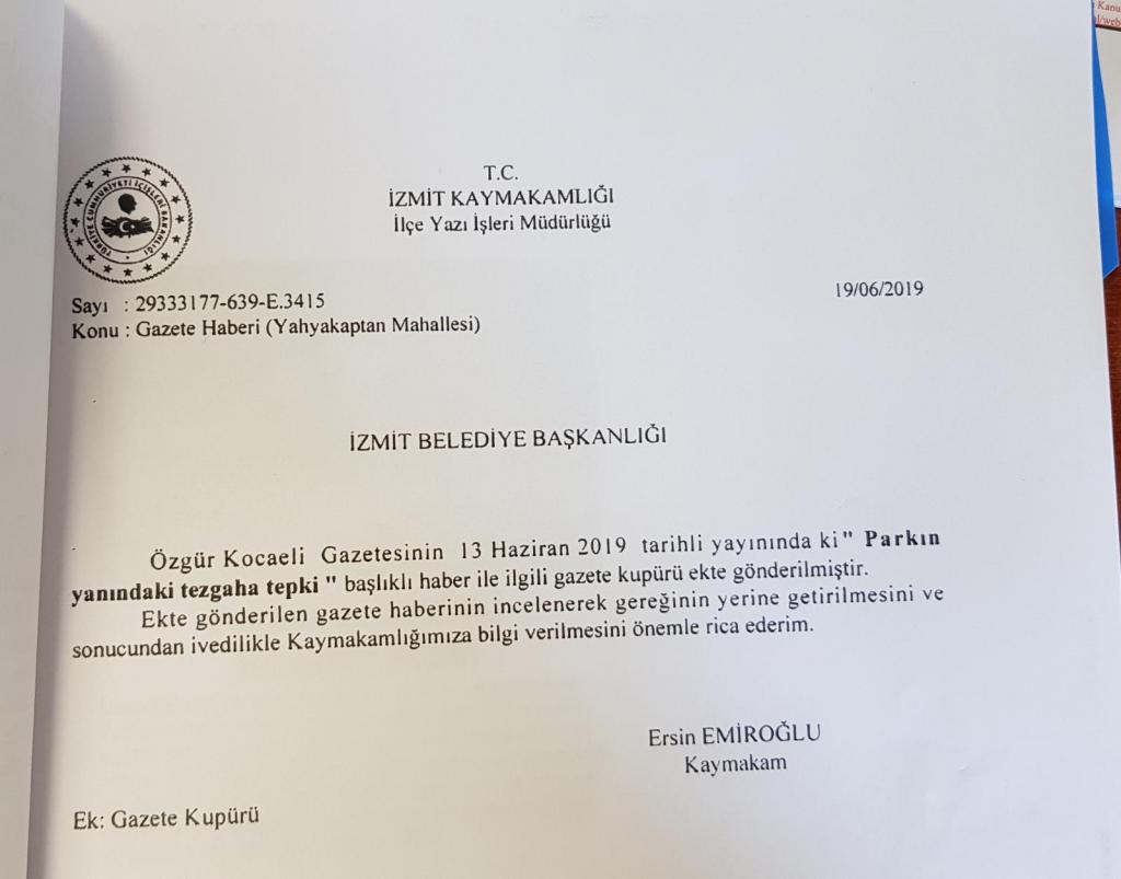 •İzmit Kaymakamlığı, İzmit Belediyesinden; yerel gazetelere “Parkın yanındaki tezgâha tepki” şeklinde haberlere konu olan yerle ilgili olayın soruşturulmasını istemiştir.