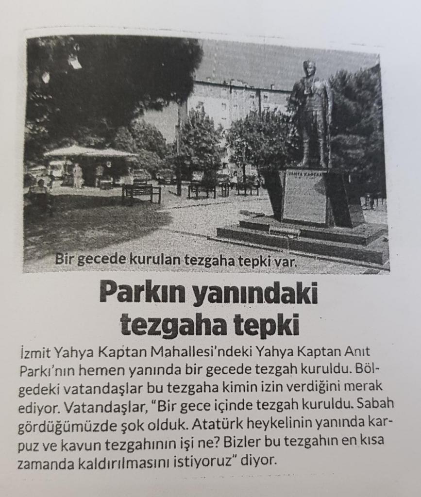 İzmit Belediyesi Yahya Kaptan mahallesinde yaşanan olayla ilgili gerçeği kamuoyu ile paylaştı. Açıklamada’ İzmit Kaymakamlığı, İzmit Belediyesinden; yerel gazetelere “Parkın yanındaki tezgâha tepki” şeklinde haberlere konu olan yerle ilgili olayın soruşturulmasını istemiştir.’ İfadelerine yer verildi.