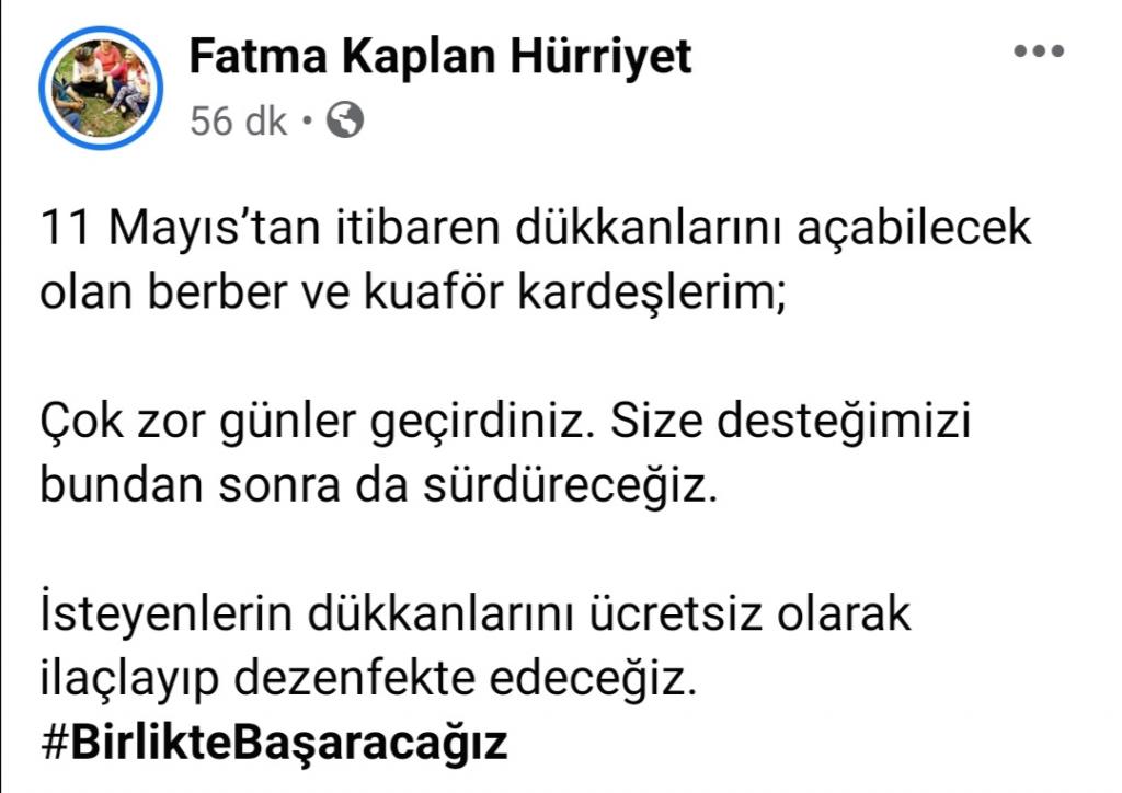 Koronavirüs salgını nedeniyle 22 Mart 2020 tarihinde kapanan berber ve kuaförlerin 11 Mayıs itibariyle sağlık kurallarına uygun bir şekilde tekrardan açılacağı duyuruldu. Bunun üzerine 1 aydan fazla süredir dükkanları kapalı olan berber ve kuaförler için İzmit Belediye Başkanı Av. Fatma Kaplan Hürriyet harekete geçerek iş yerlerinin ücretsiz olarak ilaçlayıp dezenfekte edeceklerini belirtti.