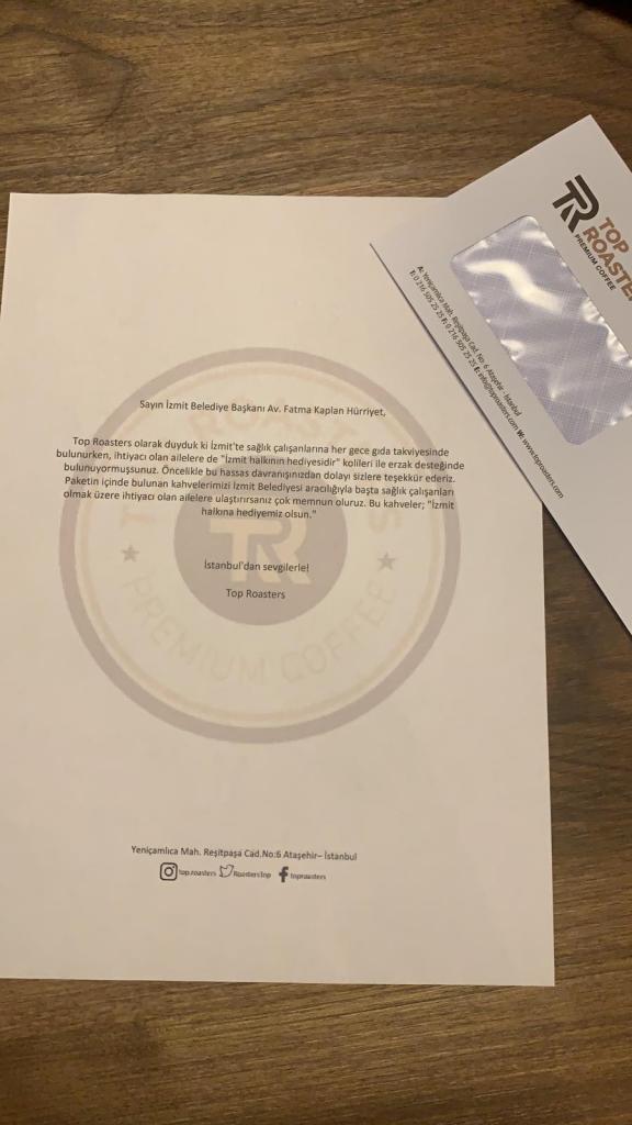 İzmit Belediyesine gönderdikleri bin paket kahvenin yanına bir de not düşen Top Roasters Kahve,  “Sayın İzmit Belediye Başkanı Av. Fatma Kaplan Hürriyet,  Top Roasters olarak duyduk ki İzmit’te sağlık çalışanlarına her gece gıda takviyesinde bulunurken ihtiyacı olan ailelere “İzmit halkının hediyesidir” kolileri ile erzak desteğinde bulunuyormuşsunuz. Öncelikle bu hassas davranışınızdan dolayı sizlere teşekkür ederiz. Paketin içinde bulunan kahvelerimizi İzmit Belediyesi aracılığıyla başta sağlık çalışanları olmak üzere ihtiyacı olan ailelere ulaştırırsanız çok memnun oluruz. Bu kahveler İzmit halkına hediyemiz olsun. İstanbul’dan sevgilerle” ifadelerini kullandı.