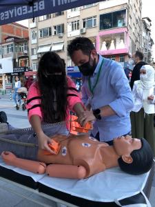 İnteraktif açık alan etkinliğinde, manken üzerinde temel yaşam desteği (solunum ve kalp durması), kanamalar, yaralanmalar, yanık, donma, sıcak çarpmaları, kırık, çıkık, burkulma, bilinç bozuklukları, zehirlenme, hayvan ısırmaları, boğulma gibi durumlarda yapılması gerekenler ile 112 acil hakkında bilgi verilerek, ev ve iş kazalarında acil durum müdahale örneklemelerinde bulunuldu.