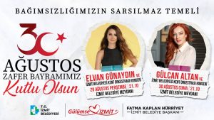 29 Ağustos Perşembe günü saat 21.00’da Elvan Günaydın ve İzmit Belediyesi Kent Orkestrası, İzmitlilerle buluşarak bayram coşkusunu İzmit Belediyesi Meydanı’nda müzikle taçlandıracak. 30 Ağustos günü ise Gülcan Altan ve İzmit Belediyesi Kent Orkestrası, yine Belediye Meydanındaki coşkulu bir konserle halkın bayram sevincini paylaşacak.