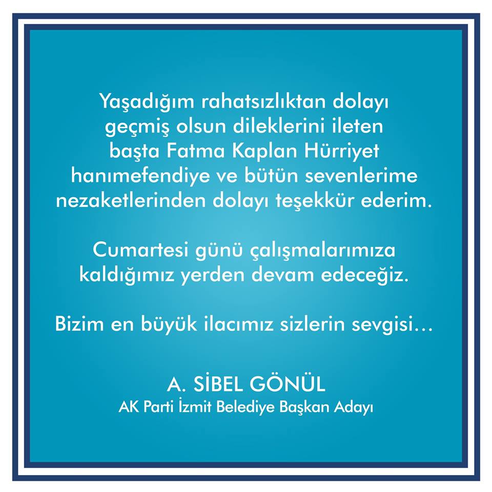AK Parti İzmit Belediye Başkan Adayı Sibel Gönül, grip salgını nedeniyle geçirdiği rahatsızlıktan dolayı sevenlerine sosyal medya üzerinden bir mesaj yayınladı. Geçirdiği rahatsızlık nedeniyle CHP İzmit Belediye Başkan Adayı Fatma Kaplan Hürriyet, Gönül’e sosyal medya üzerinden şifalar diledi. Gönderiye yorum yapan Gönül, nezaketinden dolayı Hürriyet’e teşekkür ederken, sevenlerine hitaben de “en büyük ilacımız sizlerin sevgisi” yorumunda bulundu.