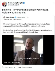 CHP Genel Başkanı Kemal Kılıçdaroğlu, İzmir Büyükşehir Belediyesi’nin yardım videosuyla “Binlerce TIR yardımla halkımızın yanındayız. Gelsinler tutuklasınlar” mesajını paylaştı.