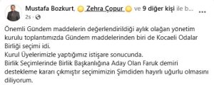 Kocaeli Berberler Odası Başkanı Mustafa Bozkurt, Esnaf ve Sanatkarlar Birliği seçiminde Başkan adaylarından Faruk Demir’e destek vereceklerini sosyal medya hesabından yaptığı paylaşımla duyurdu.
