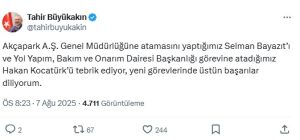Sosyal medya hesabından açıklama yapan Büyükşehir Belediye Başkanı Tahir Büyükakın, “Akçapark A.Ş. Genel Müdürlüğüne atamasını yaptığımız Selman Bayazıt’ı ve Yol Yapım, Bakım ve Onarım Dairesi Başkanlığı görevine atadığımız Hakan Kocatürk’ü tebrik ediyor, yeni görevlerinde üstün başarılar diliyorum.” ifadelerini kullandı