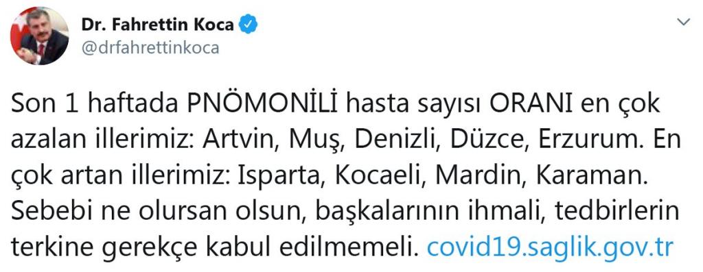 Son 1 haftada pnömonili hasta sayısı oranı en çok azalan illerimiz: Artvin, Muş, Denizli, Düzce, Erzurum. En çok artan illerimiz: Isparta, Kocaeli, Mardin, Karaman.