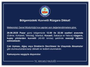 29/06/ 2025 Pazar günü saat 12:00 ile 22:00 saatleri arasında rüzgarın kuzey yönlerden kuvvetli esmesi beklendiğinden, olumsuzluklara karşı dikkatli olunması istendi.