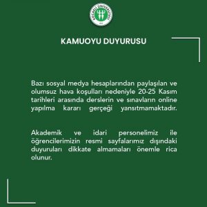 Kocaeli Üniversitesi’nden son dakika duyurusu. Bazı sosyal medya hesaplarından paylaşılan ’20-25 Kasım tarihleri arasında derslerin ve sınavların online yapılma kararı gerçeği yansıtmamaktadır” denildi.