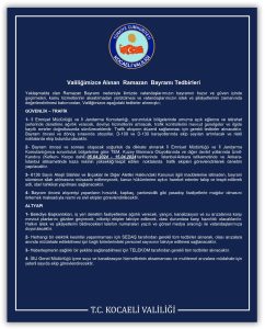 Kocaeli Valiliği, Ramazan Bayramı’nın manevi ikliminde, huzur ve güven ortamında geçmesi için bir dizi tedbir aldı.