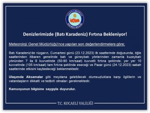 Kocaeli Valiliği, 23/12/2023 Cumartesi günü için fırtına uyarısında bulundu. Vatandaşların olumsuzluklara karşı dikkatli olmalarını istedi.