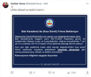 “Meteoroloji Genel Müdürlüğü’nce yapılan son değerlendirmelere göre; Batı Karadeniz’de rüzgarın yarın (09.10. 2023 Pazartesi) günün ilk saatlerinden itibaren kuzey ve kuzeydoğudan, doğusu kuzeybatıdan 7 yer 8 kuvvetinde (50-75 km/ saat) fırtına şeklinde eseceği tahmin ediliyor.