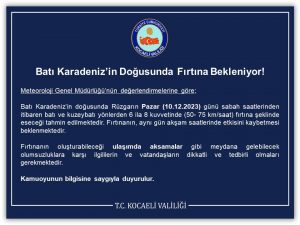 Kocaeli Valili uyardı. 10/12/2023 Pazar günü için dikkatli olunması istendi.