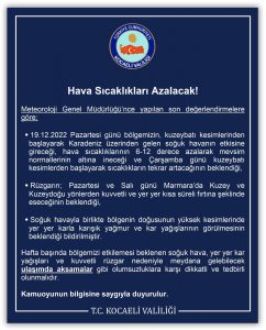 19/12/ 2022 ve 20/12/2022 tarihlerine dikkat çekildi. Fırtına uyarısı yapıldı, soğuk havanın etkisine girileceğinden dikkatli olunması istendi. Yüksek kesimlerde karla karışık yağmur ve kar yağışı bekleniyor.