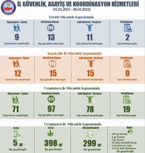 Vali Yavuz’un sosyal medya hesabında yaptığı paylaşımda son bir haftada Kocaeli’nde terörle mücadele kapsamında 9 operasyon düzenlendiği, bu operasyonlarda 13 kişinin gözaltına alındığı, yapılan işlemleri sonrası 11 kişi serbest kalırken,  2 kişinin tutuklandığı ifade edildi. Yavuz’un sosyal medya hesabında hazırlanan grafikler ile yapılan paylaşımında, kaçakçılıkla mücadele kapsamında 12 operasyon düzenlendiği,  bu operasyonlarda 15 kişinin gözaltına alındığı ve işlemleri sonrası serbest kaldığı belirtildi.