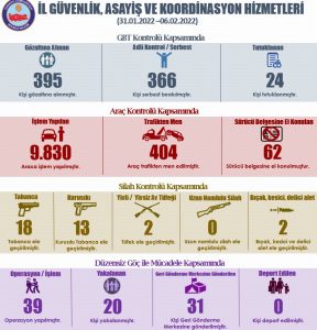 Yavuz’un Uyuşturucu ile mücadele kapsamında açıkladığı rakamlarda ise son bir haftada düzenlenen 71 operasyonda, 97 kişinin gözaltına alındığı bu kişilerden 19’nun tutuklandığı, 78’nin ise işlemleri sonrası serbest bırakıldığı öğrenildi. Ayıca bu operasyonlarda 5 gram Eroin, 398 gram Esrar, 649 gram Bonzai,, 299 gram Metamfetamin, 9 gram Skunk, 23 sentetik ecza, 4 gram Kokain, 23  uyuşturucu hap, 14 bin 126 dal dolu makaron ele geçirildiği belirtildi.