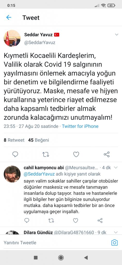 Kocaeli’nde  her gün yapılan denetimlerde hala karantina ihlali yapan, sosyal mesafeyi hiçe sayan yada maske takmayan karın görülmesi üzerine Kocaeli Valisi Seddar Yavuz, sosyal paylaşım hesabından önemli bir duyuruda bulundu. Yavuz,  “Kıymetli Kocaelili Kardeşlerim,