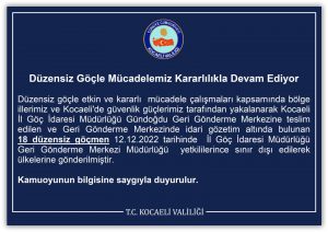 Kocaeli’de güvenlik güçleri 18 düzensiz göçmen yakalandı. Kocaeli Valisi Seddar Yavuz, güvenlik güçleri tarafından yakalanan ve Kocaeli İl Göç İdaresi’ne teslim edilen 18 düzensiz göçmenin sınır dışı edilerek ülkelerine gönderildiğini açıkladı.